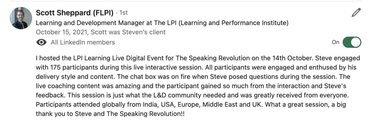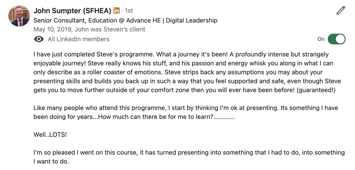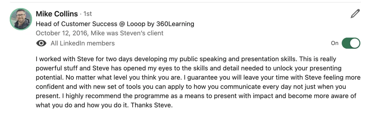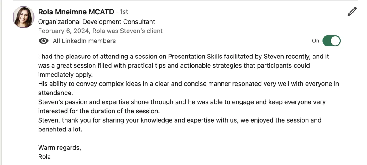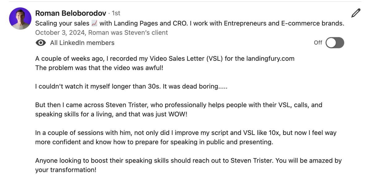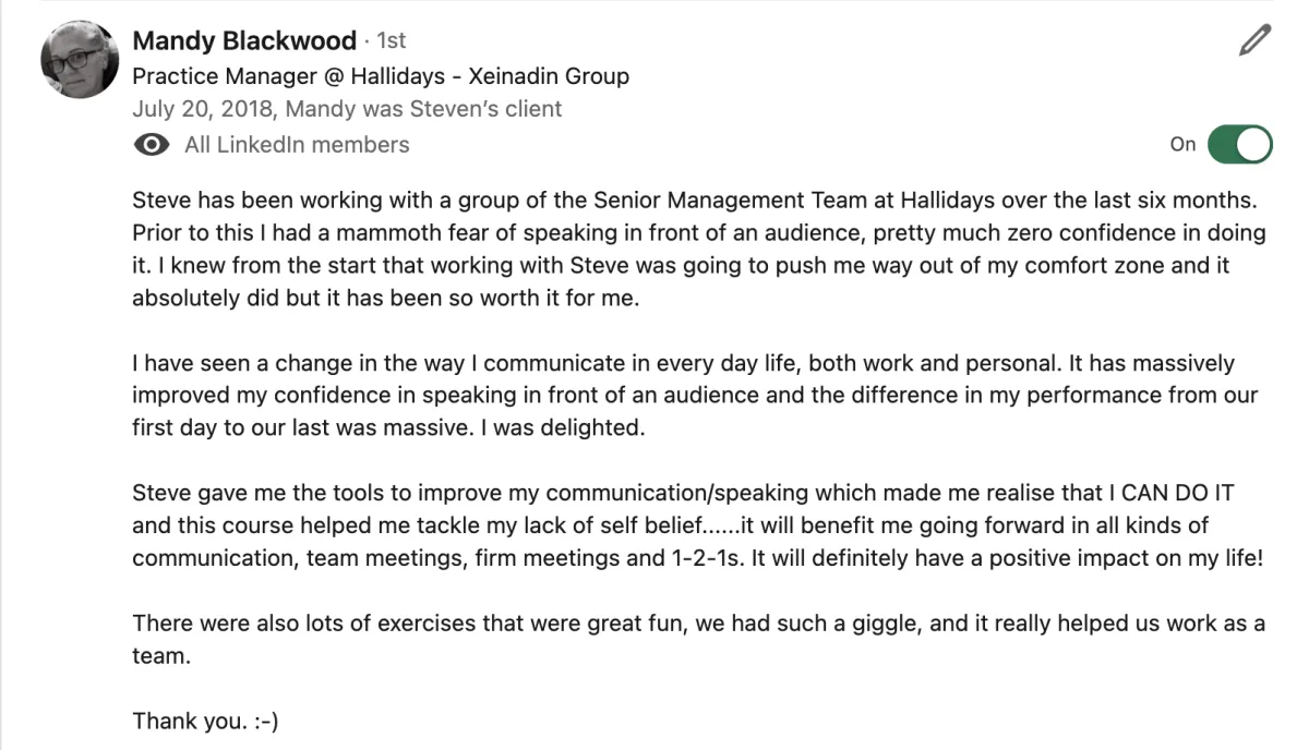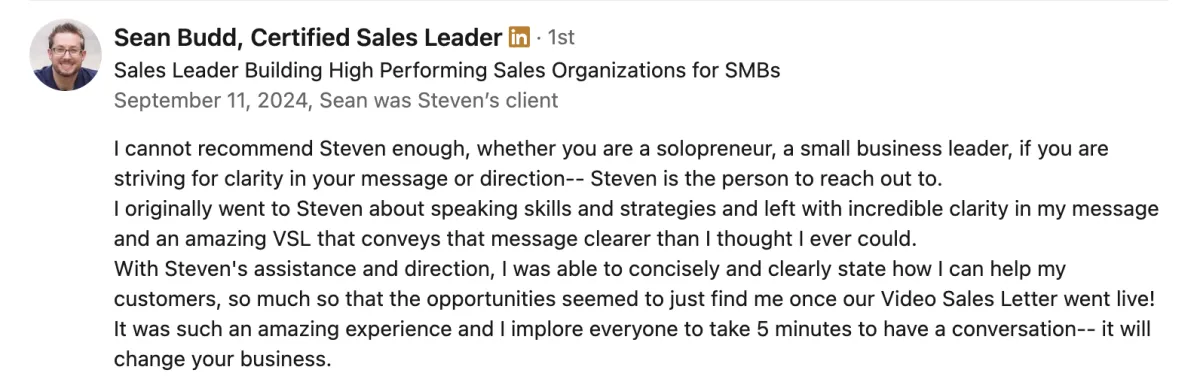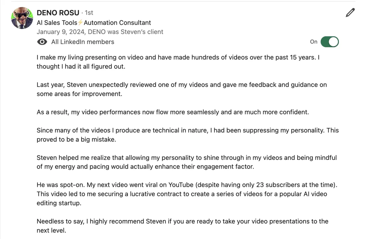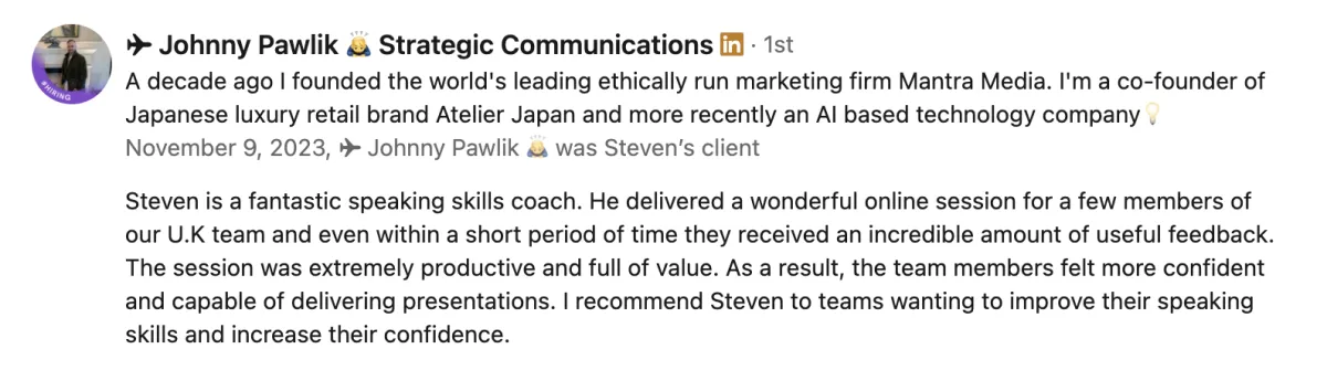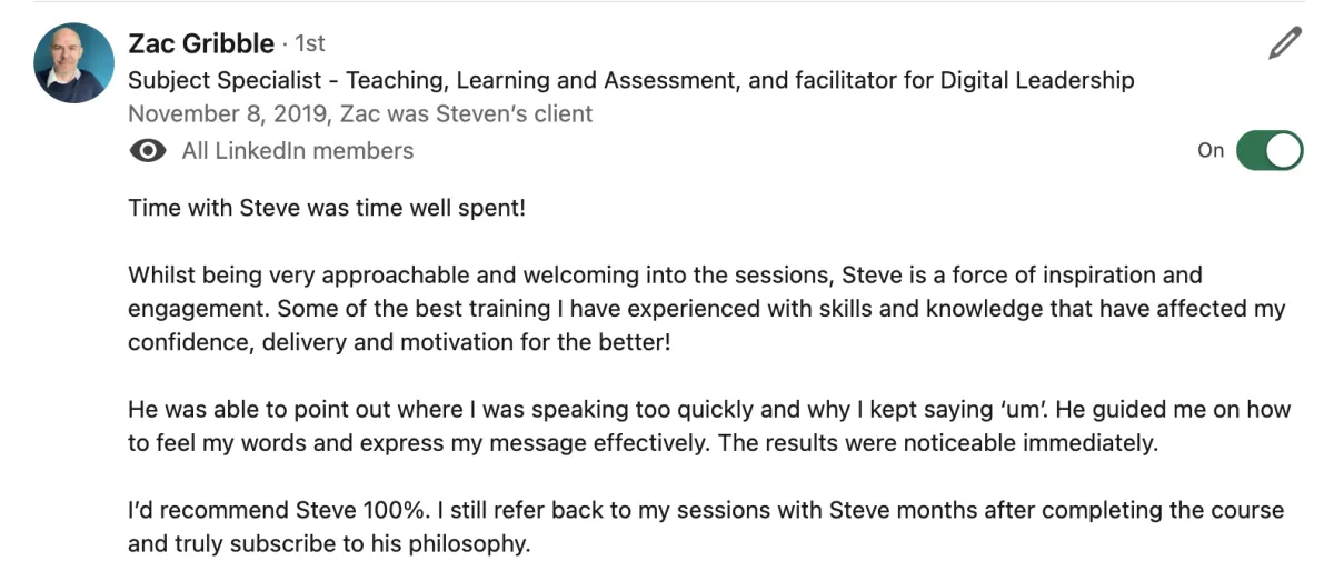 "Steven really levelled up my delivery. These are skills I can take to the stage and on my YouTube videos. It's really going to enhance my business. He is the best in the business.